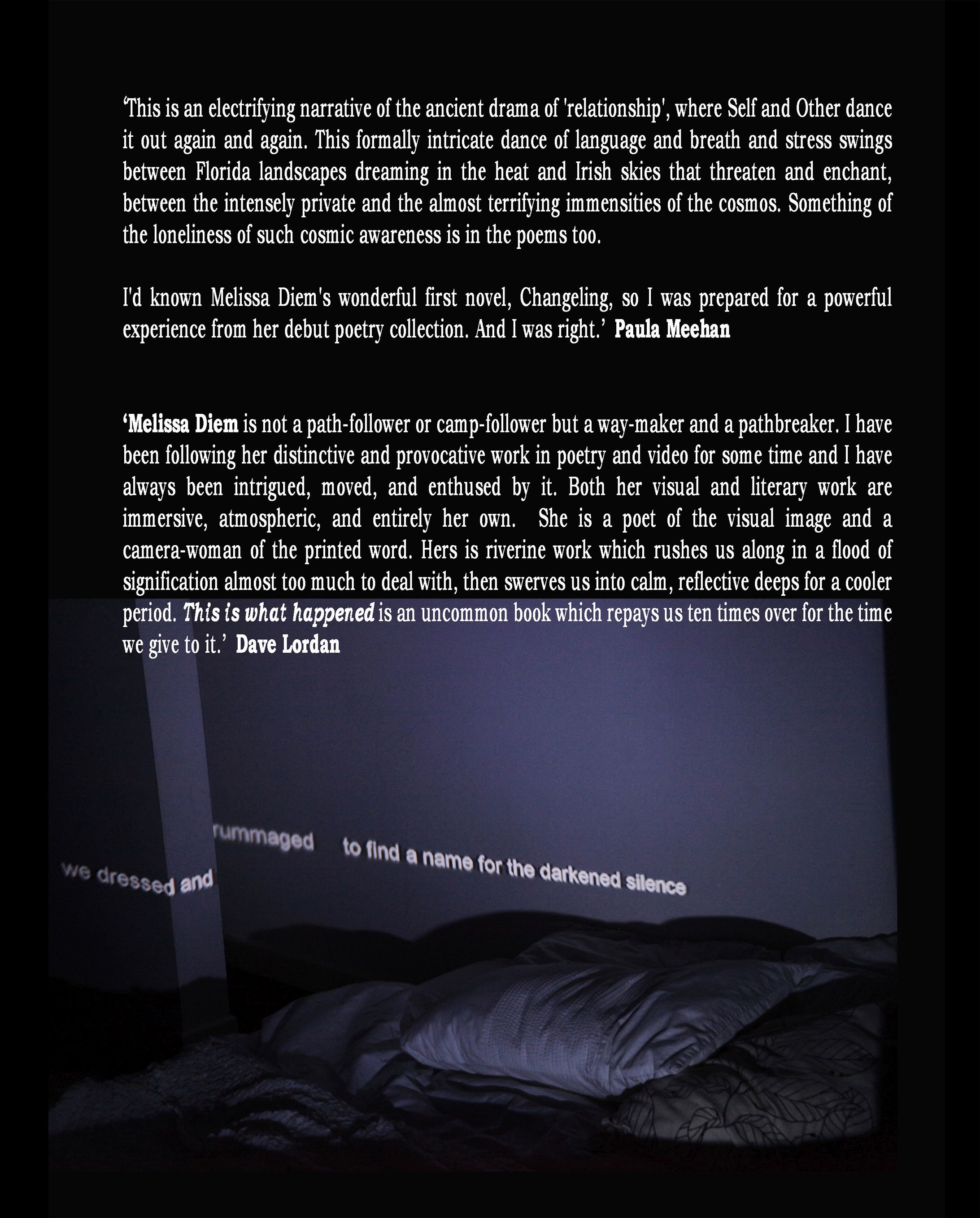 ‘Melissa Diem is not a path-follower or camp-follower but a way-maker and a pathbreaker. I have been following her distinctive and provocative work in poetry and video for some time and I have always been intrigued, moved, and enthused by it. Both her visual and literary work are immersive, atmospheric, and entirely her own. She is a poet of the visual image and a camera-woman of the printed word. Hers is riverine work which rushes us along in a flood of signification almost too much to deal with, then swerves us into calm, reflective deeps for a cooler period. This is what happened is an uncommon book which repays us ten times over for the time we give to it.’ Dave Lorden
